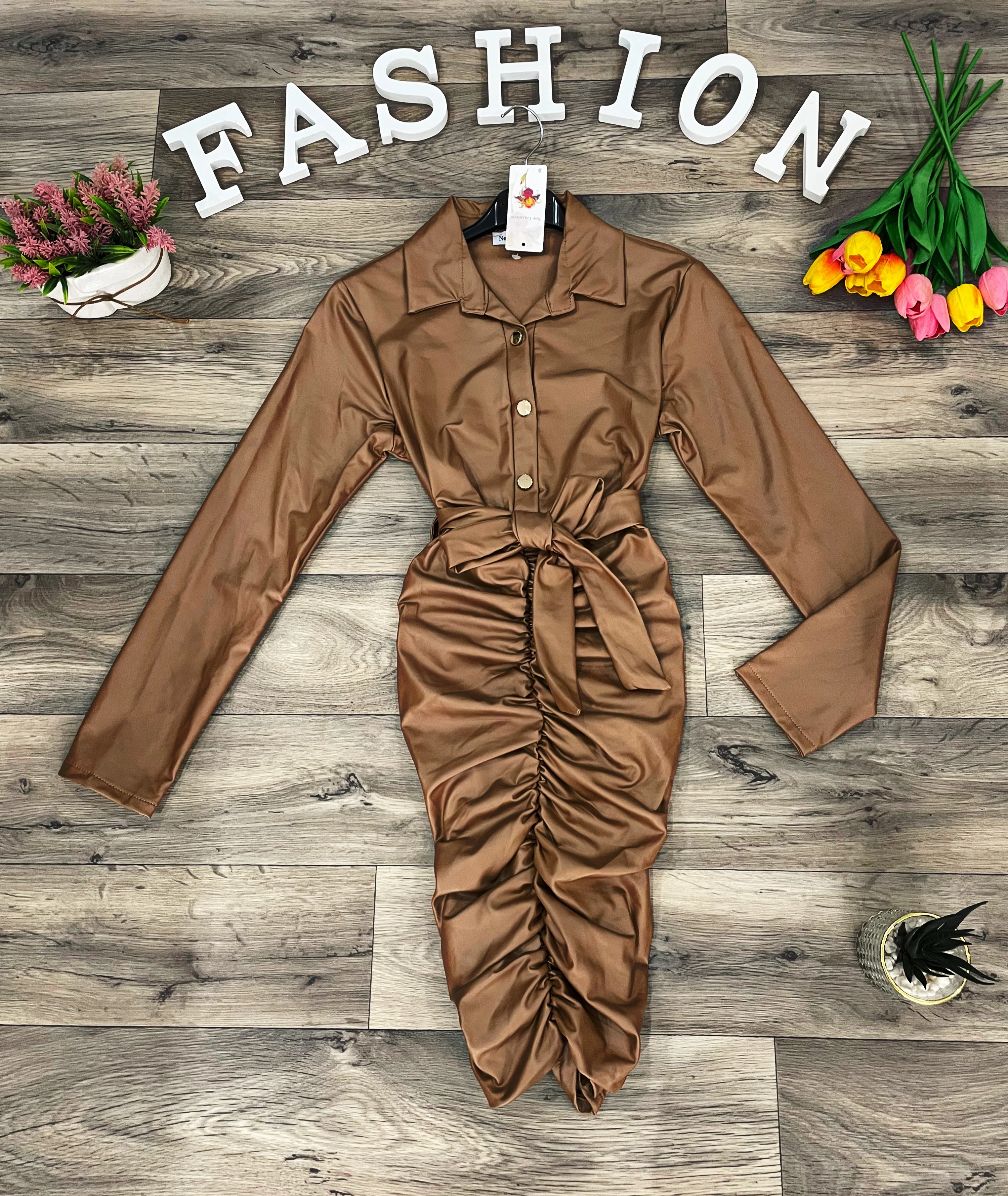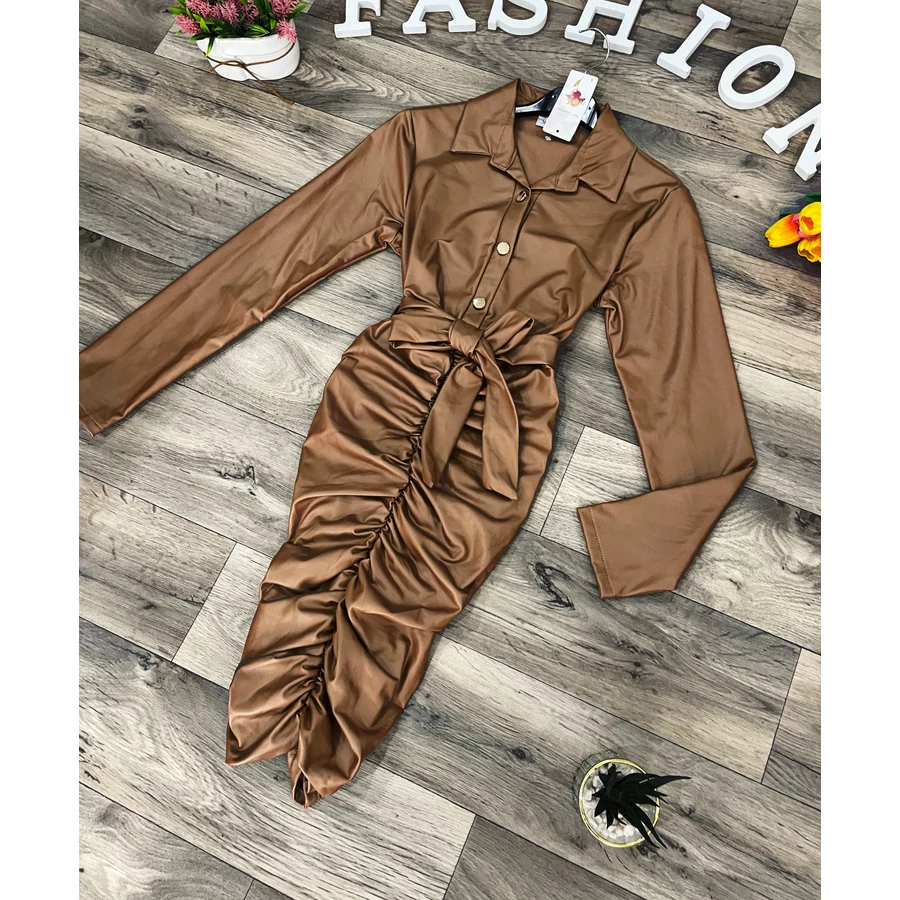 SAMIRA bézs kötött ruha inggel és műbőr övvel