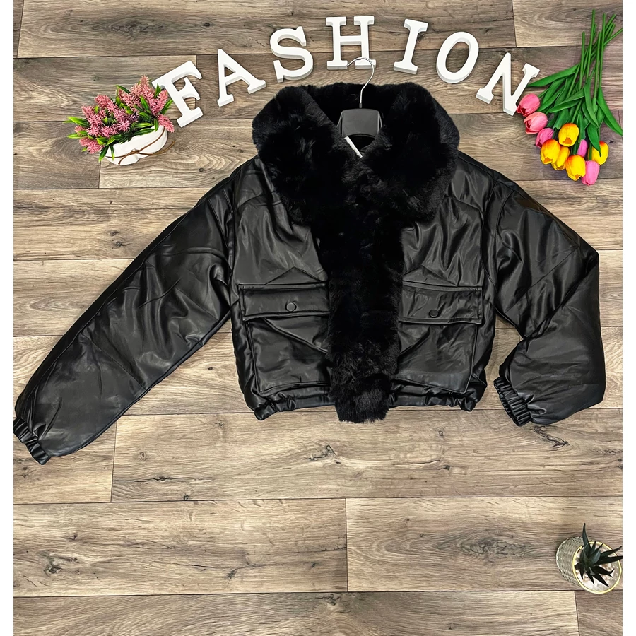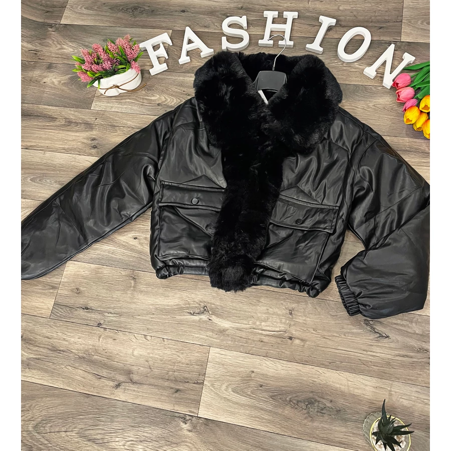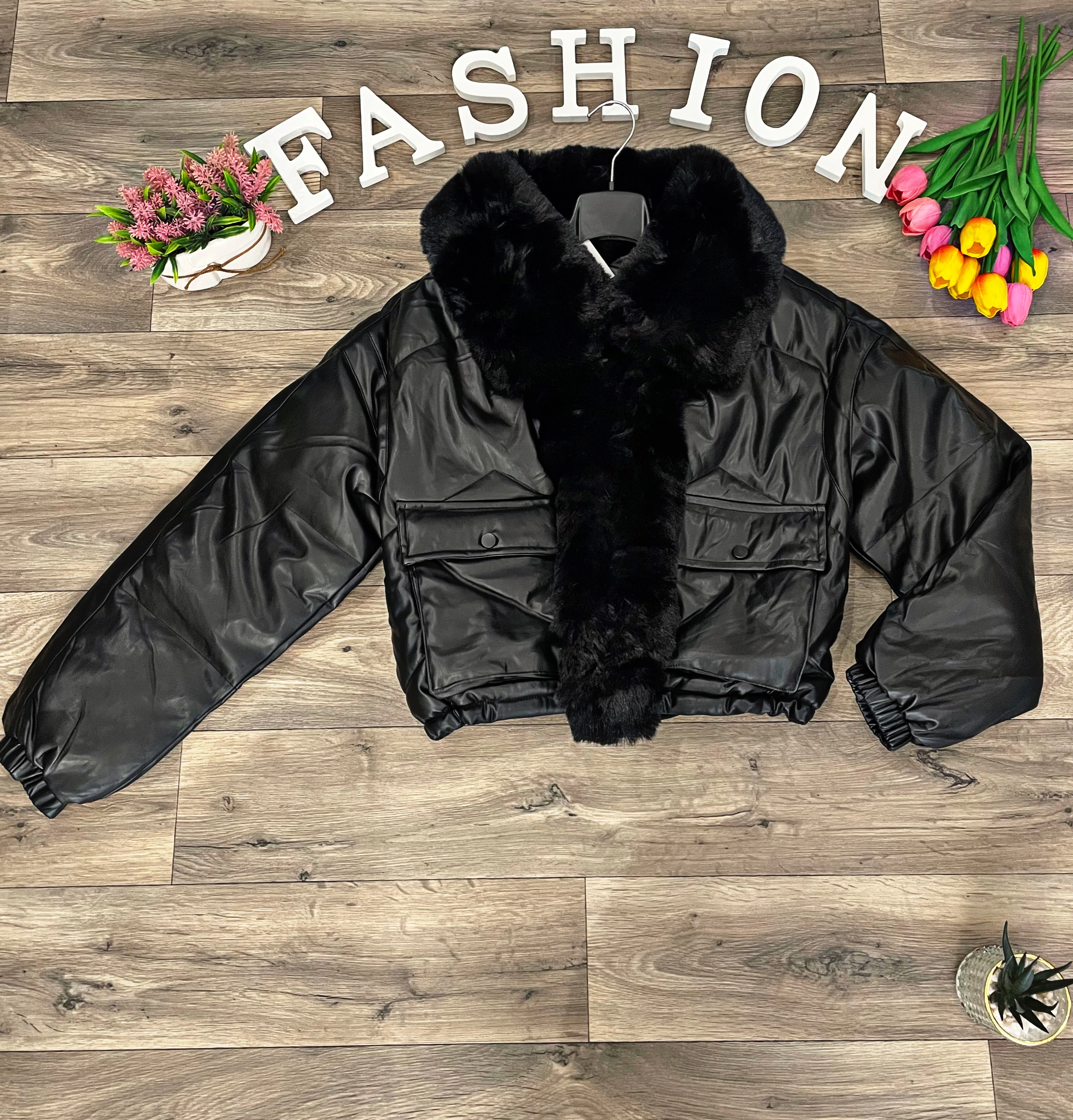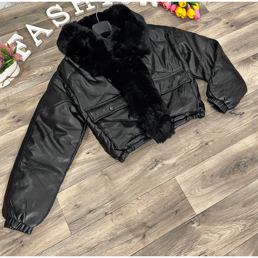 Vastag, meleg bélelt műbőr kabát szőrmével. Dereka meghúzható.