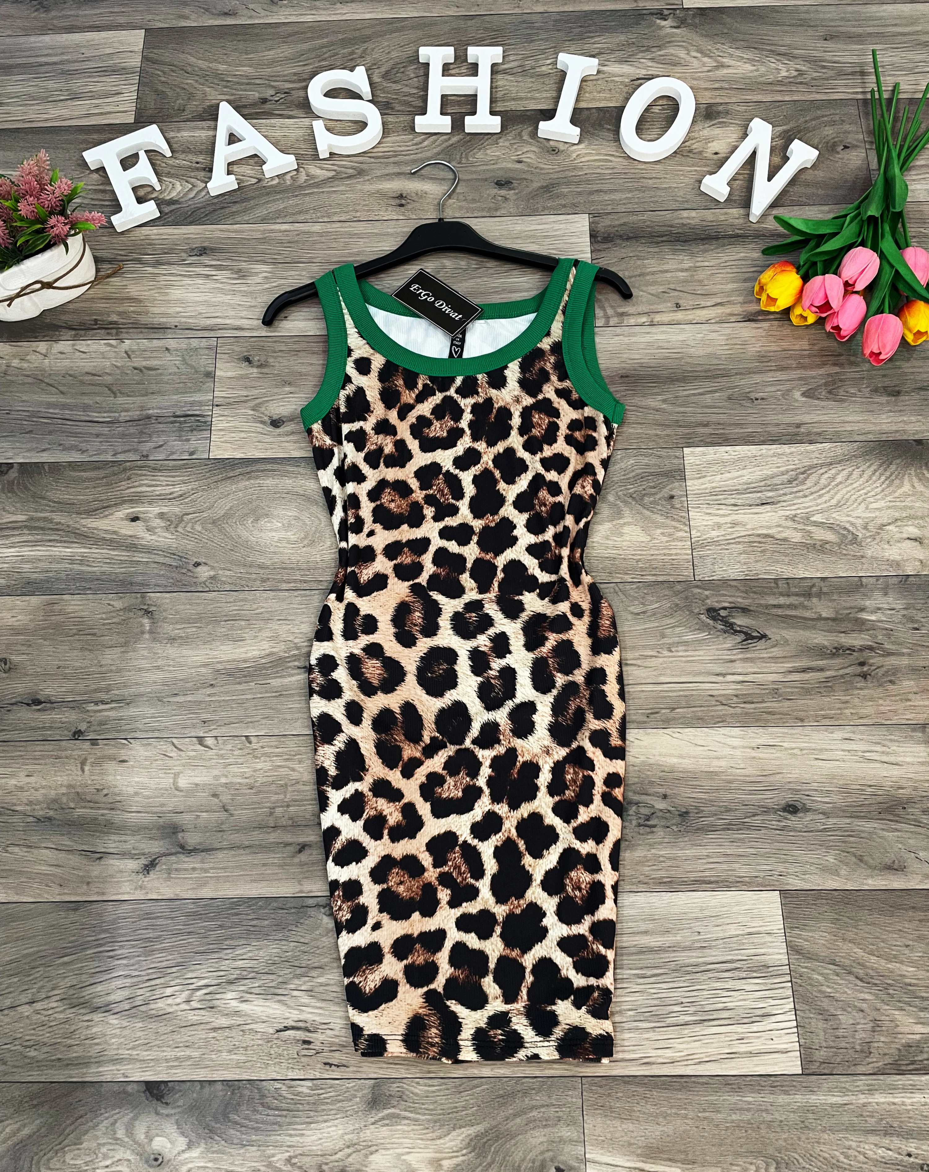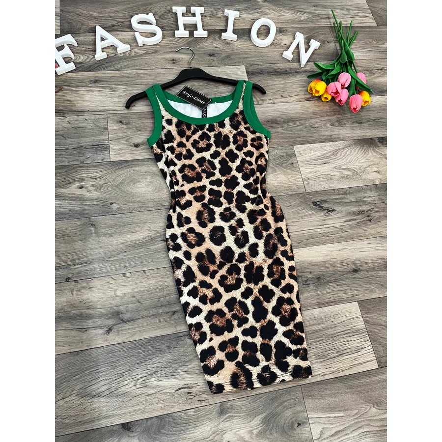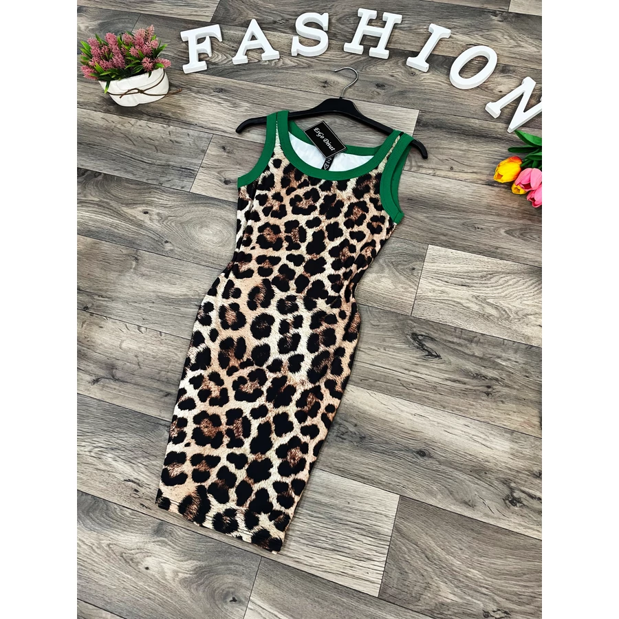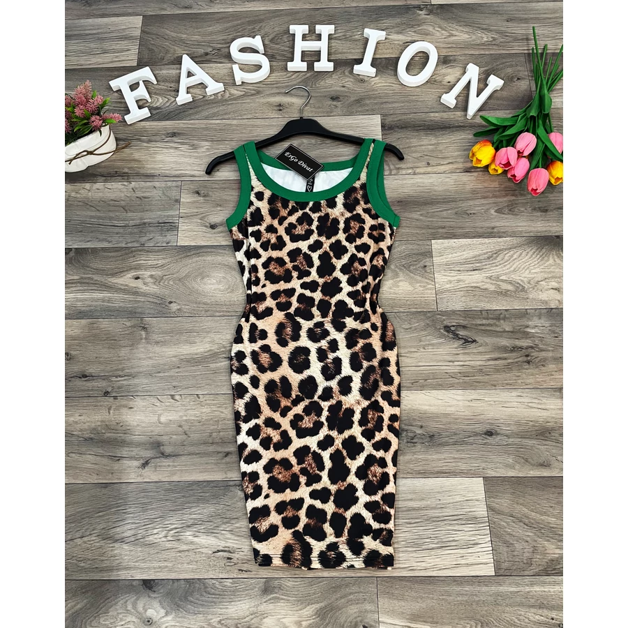 Bordázott, rugalmas anyagú leopárd mintás trikóruha.