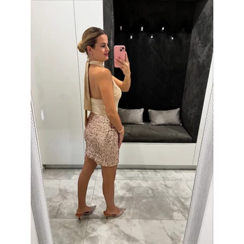 Elasztikus anyagú, hátán kivágott testhezálló ruha. Felsője szivacsos mellbetétes, szoknyája flitterrel díszített. XS-től kisebb L méretig ajánljuk. |