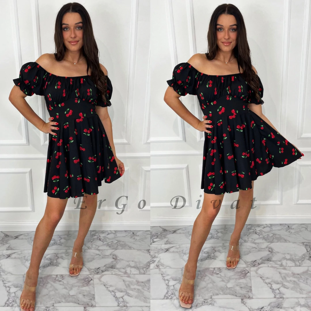 Elasztikus, gumis derekú gyümölcs mintás ruha A vonalú szoknyával.