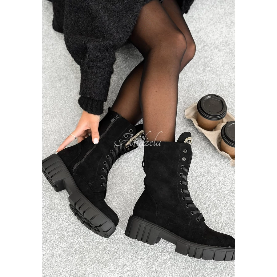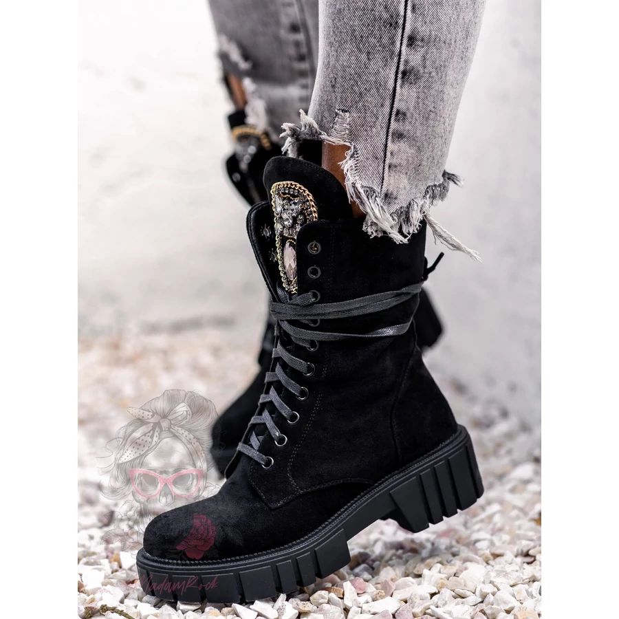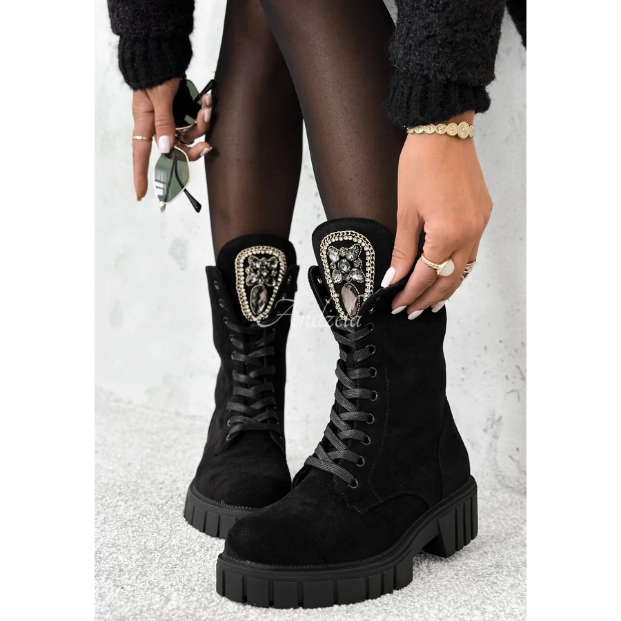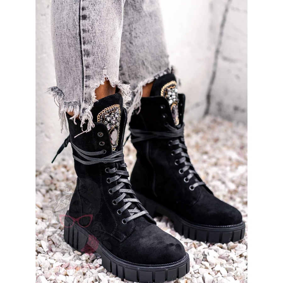 Velúr anyagú kövekkel díszített fűzős bakancs.