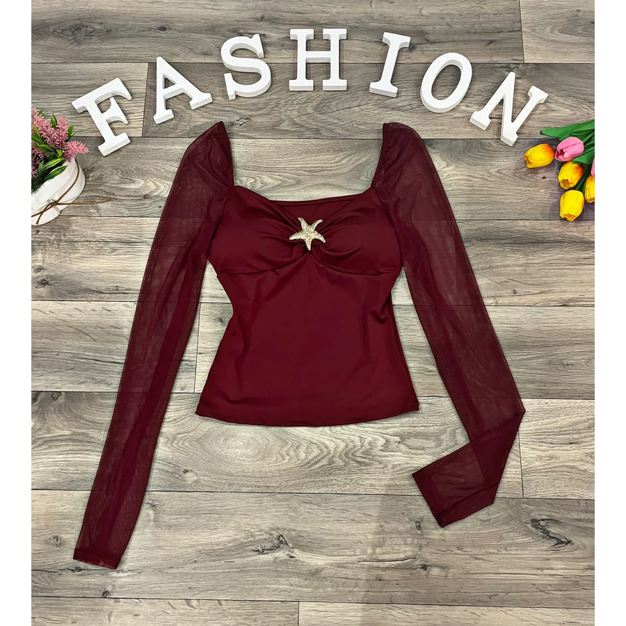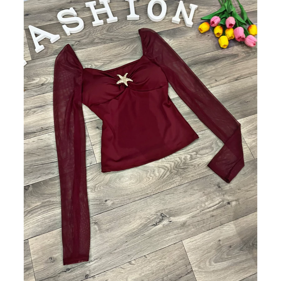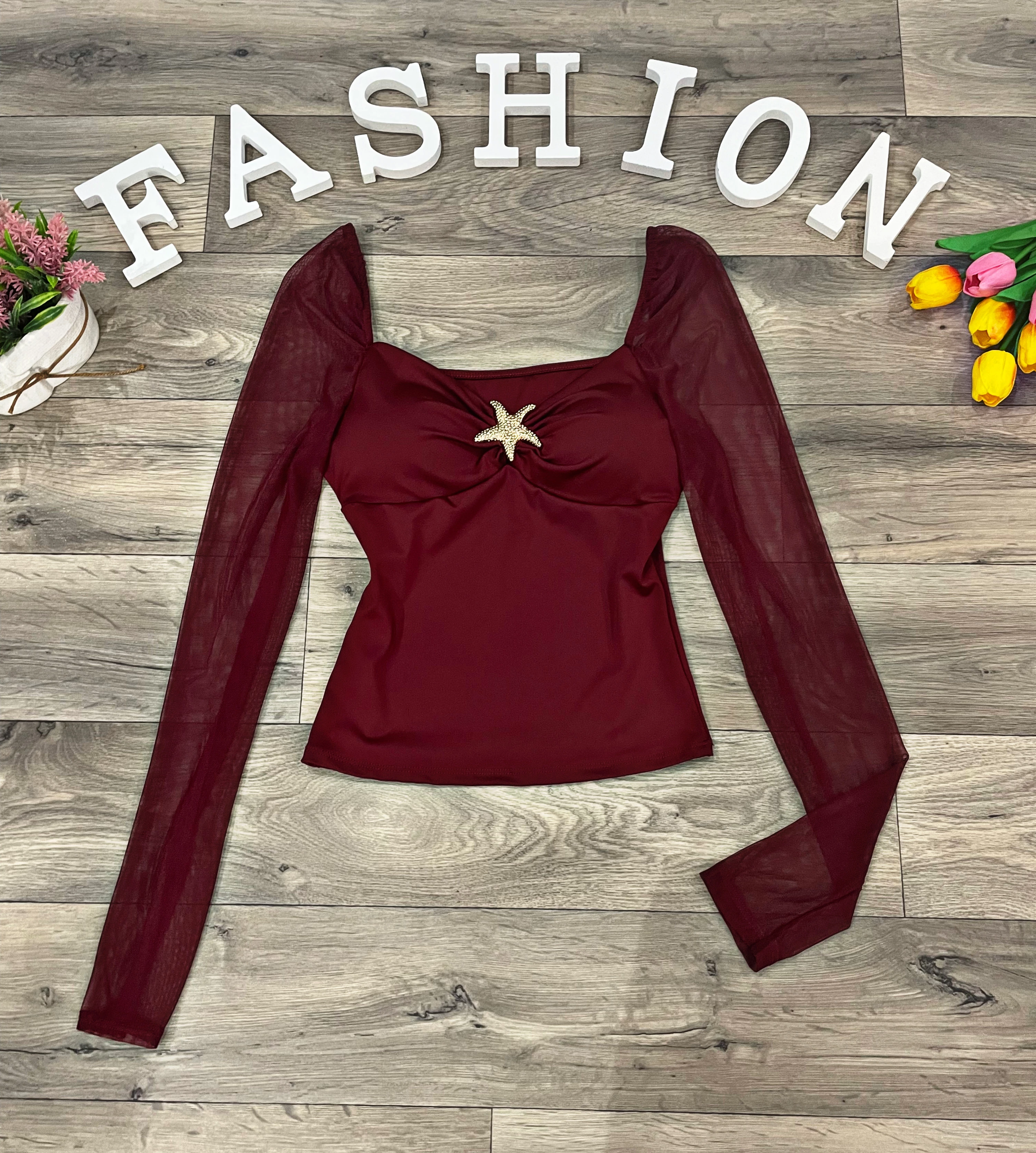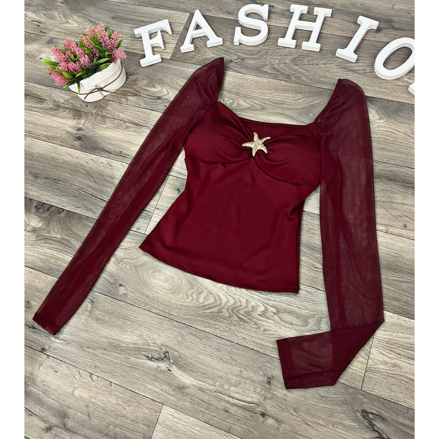 Elasztikus anyagú felső szivacsos mellbetéttel és tüll ujjakkal.