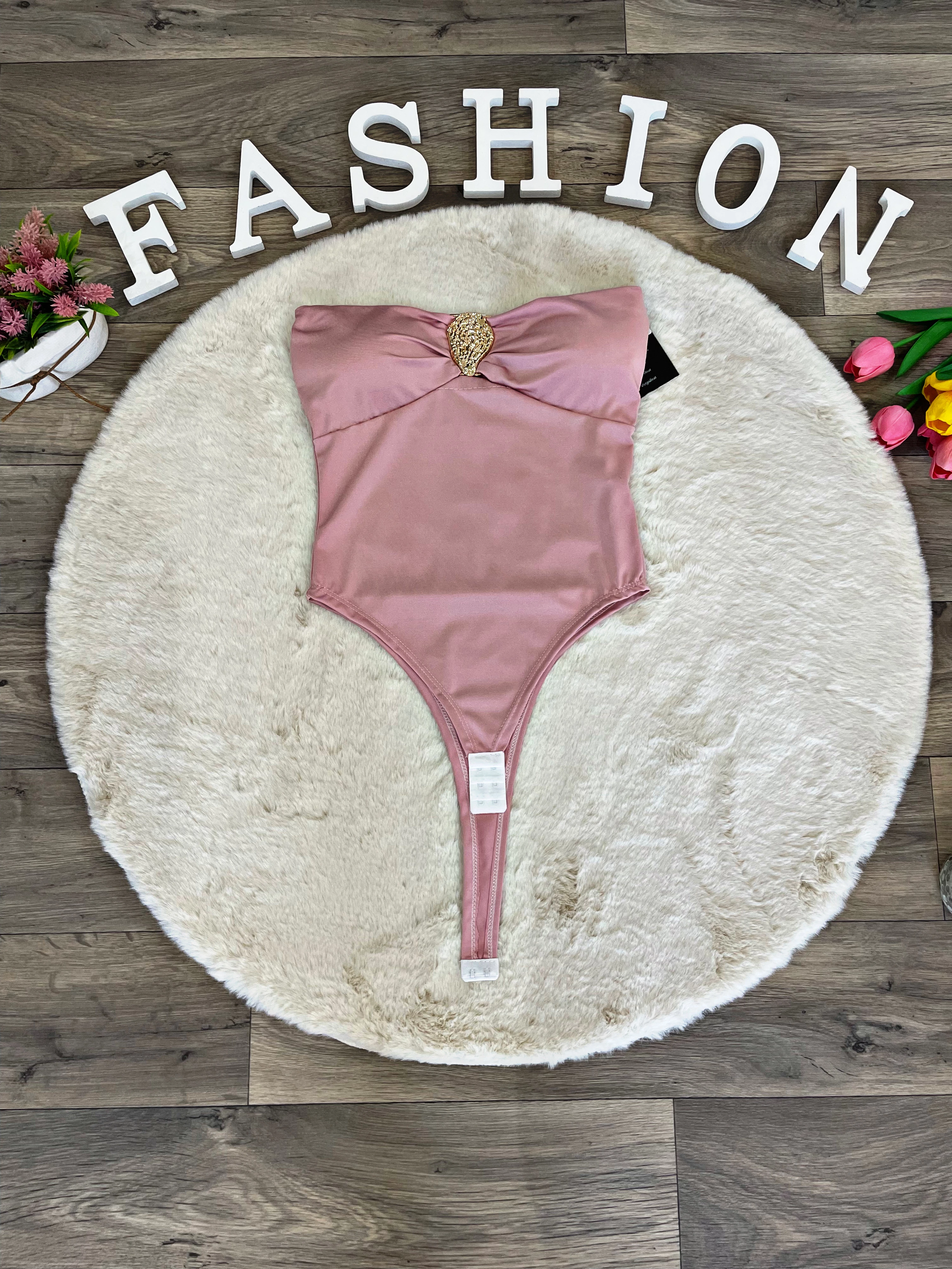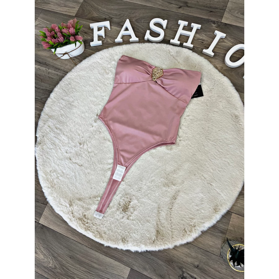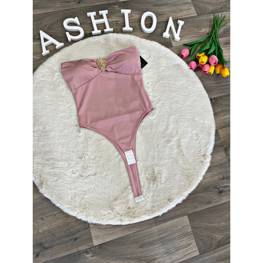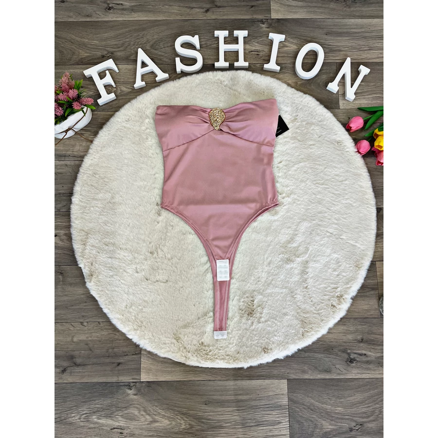 Elasztikus anyagú váll nélküli body mellnél fém dísszel.