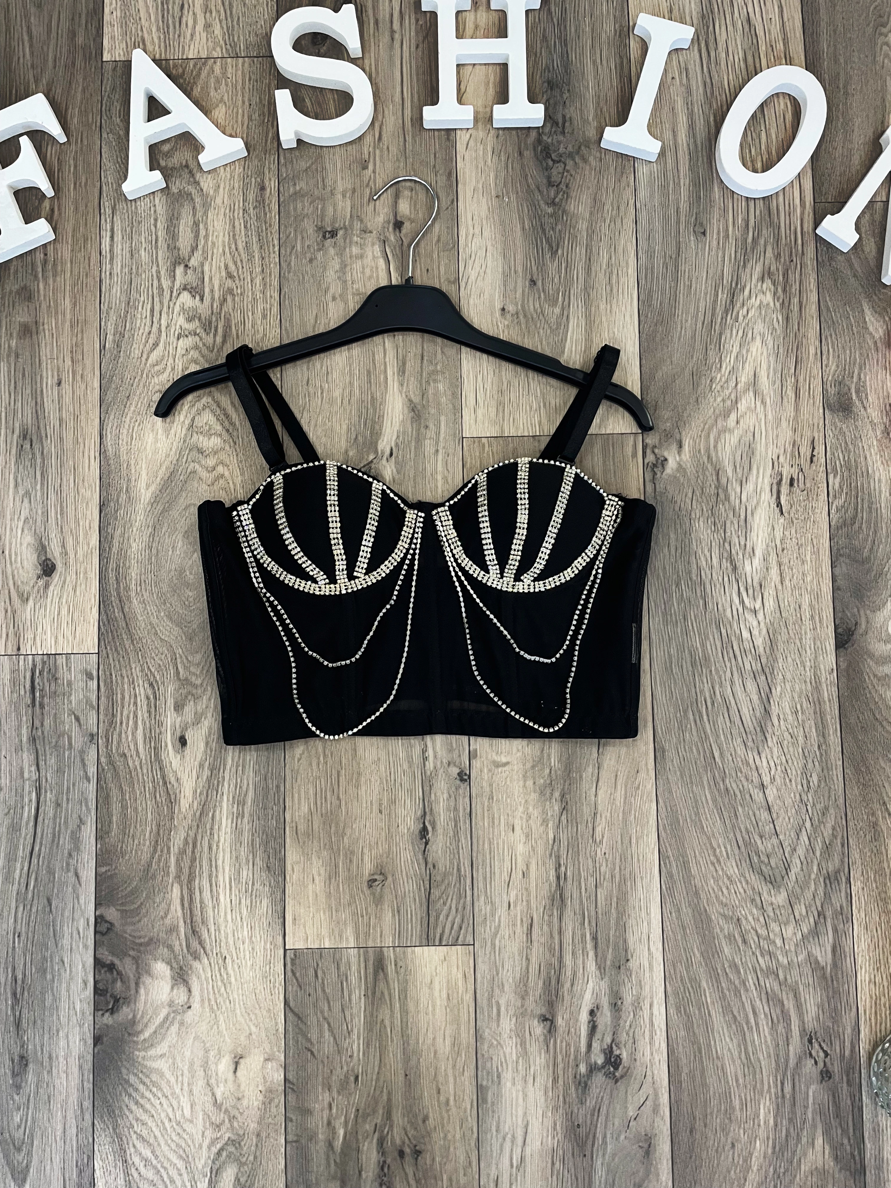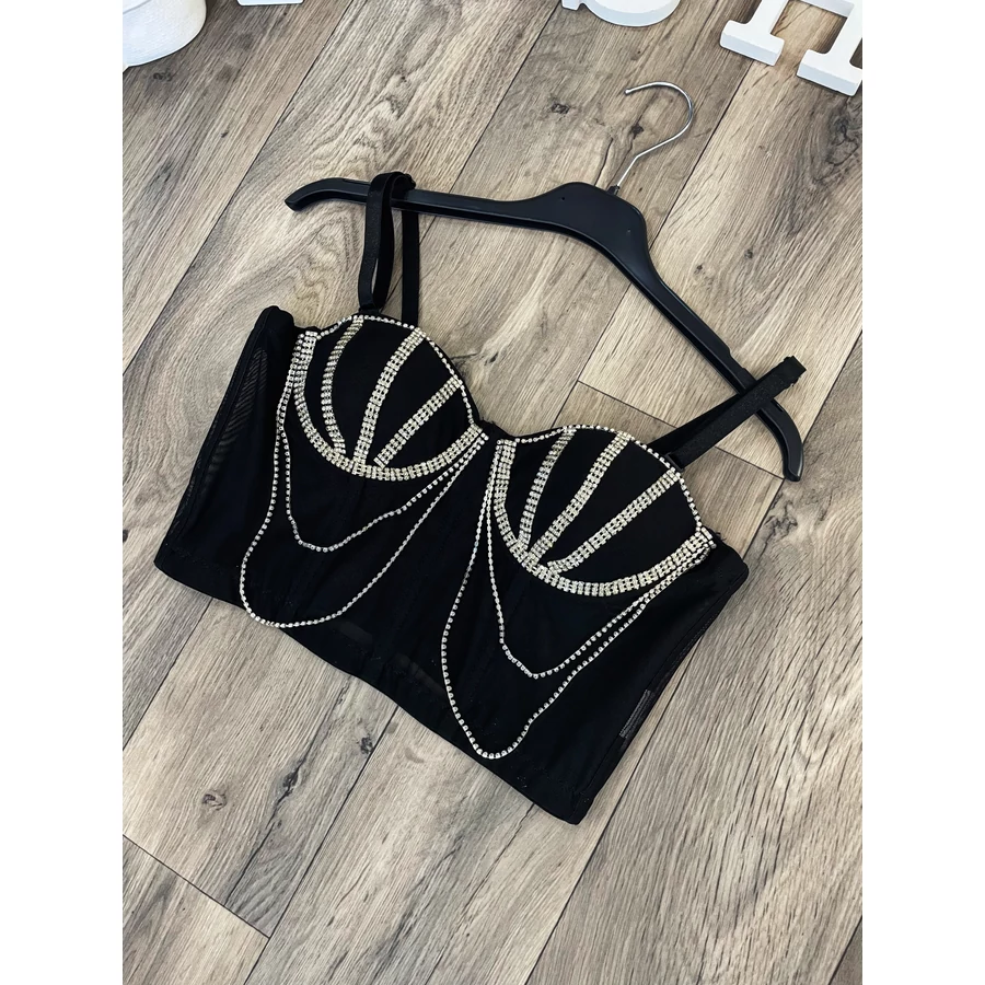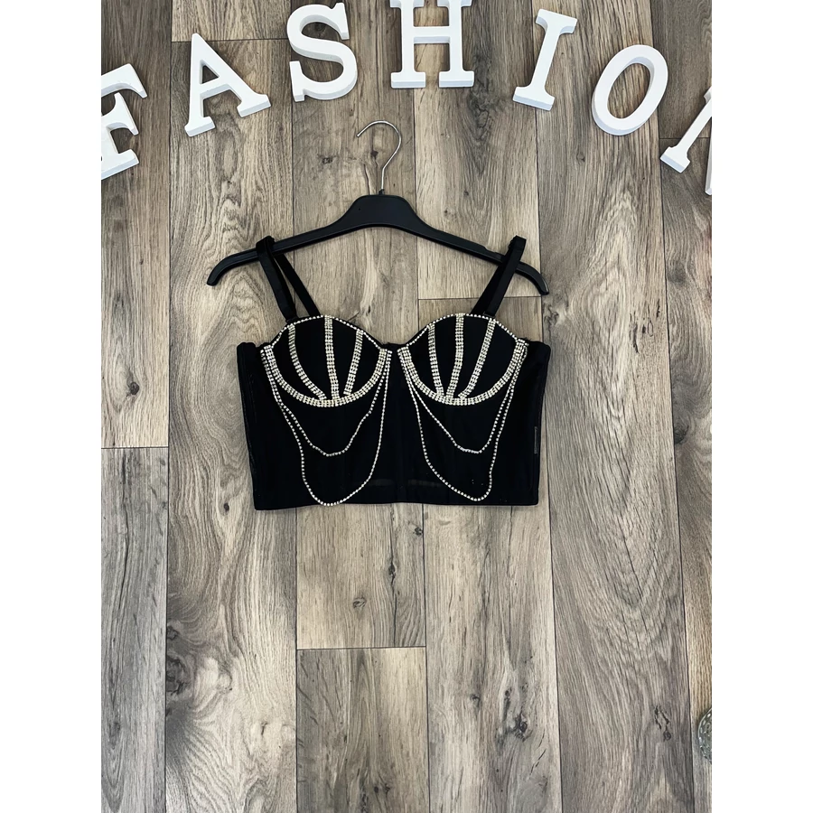Ez a merész felső garantáltan magára vonja a figyelmet, köszönhetően a fűzőszerű, átlátszó anyagnak és a csillogó láncokkal díszített részleteknek. A testhez simuló fazon kiemeli az alakot, miközben az elegáns fekete szín tökéletes alapot nyújt a látványos díszítéseknek. Az érzéki megjelenés mellett a felső egyaránt stílusos és modern, ideális választás egy különleges esti programra. Kombináld egy egyszerű szoknyával vagy nadrággal, és garantáltan ellenállhatatlan leszel.