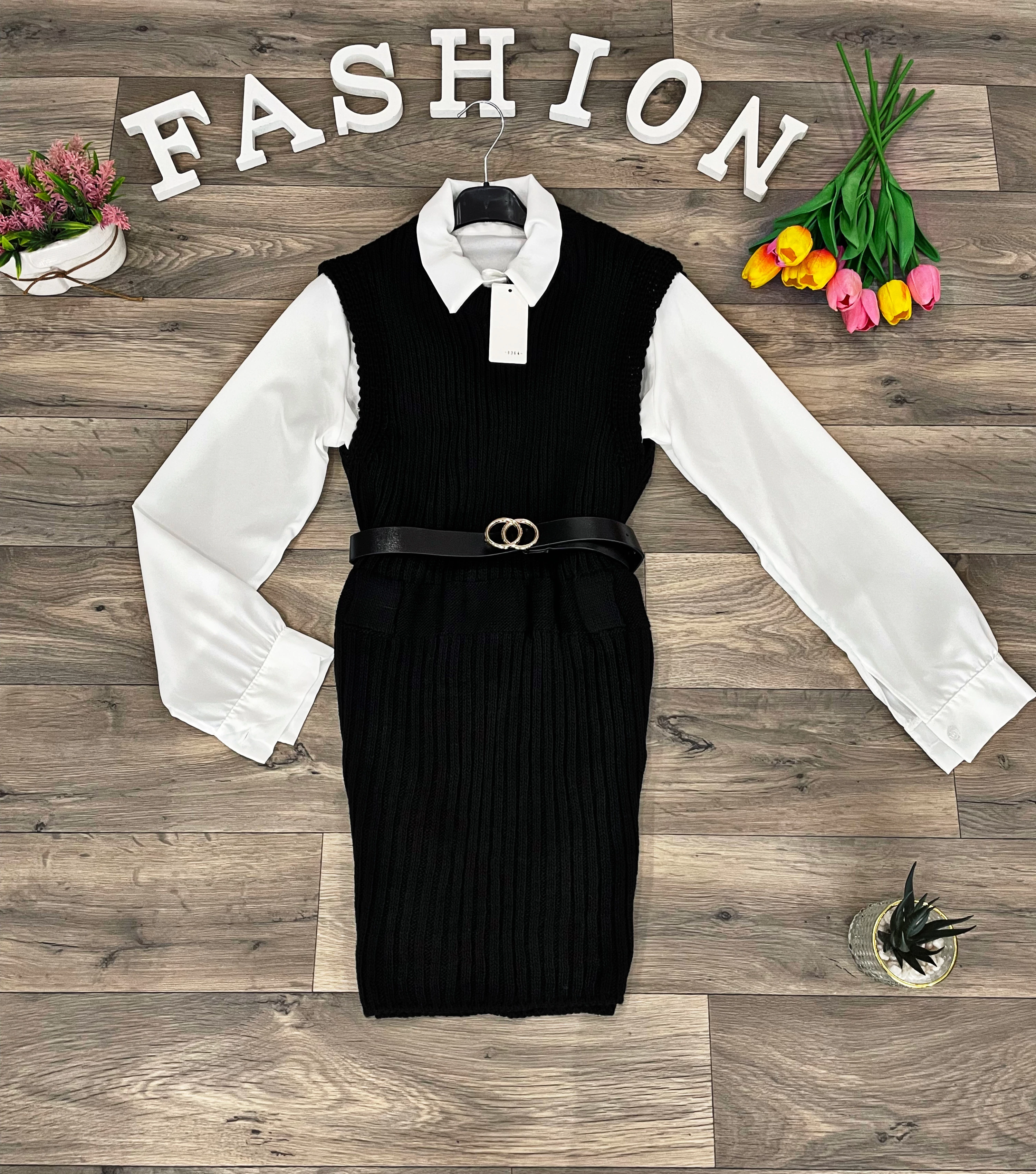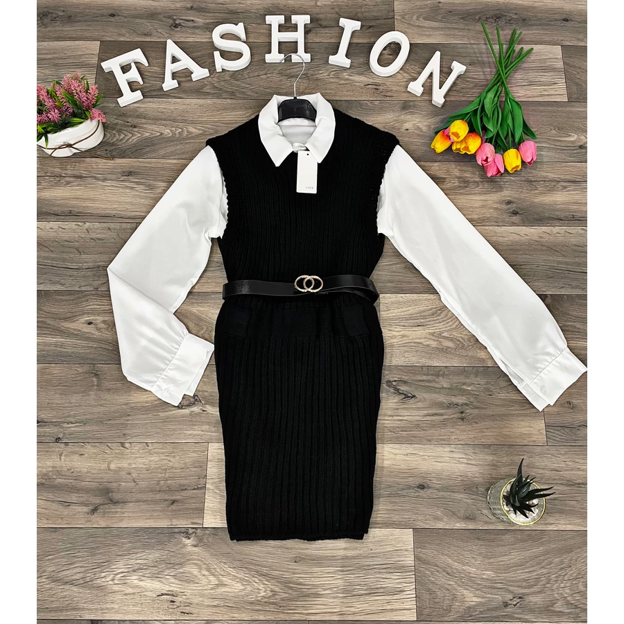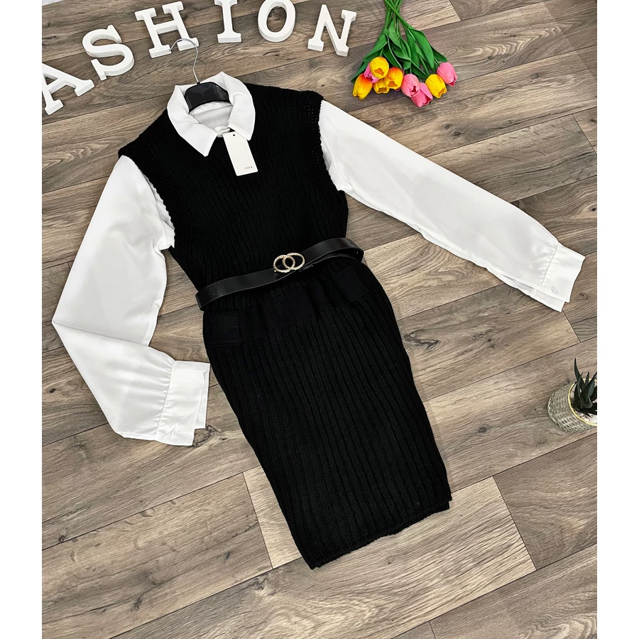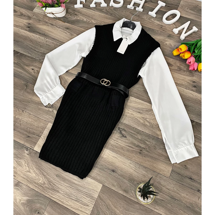 Elasztikus anyagú kötött ruha fehér inggel és műbőr övvel.