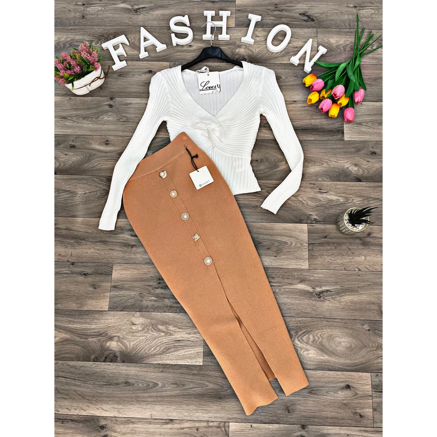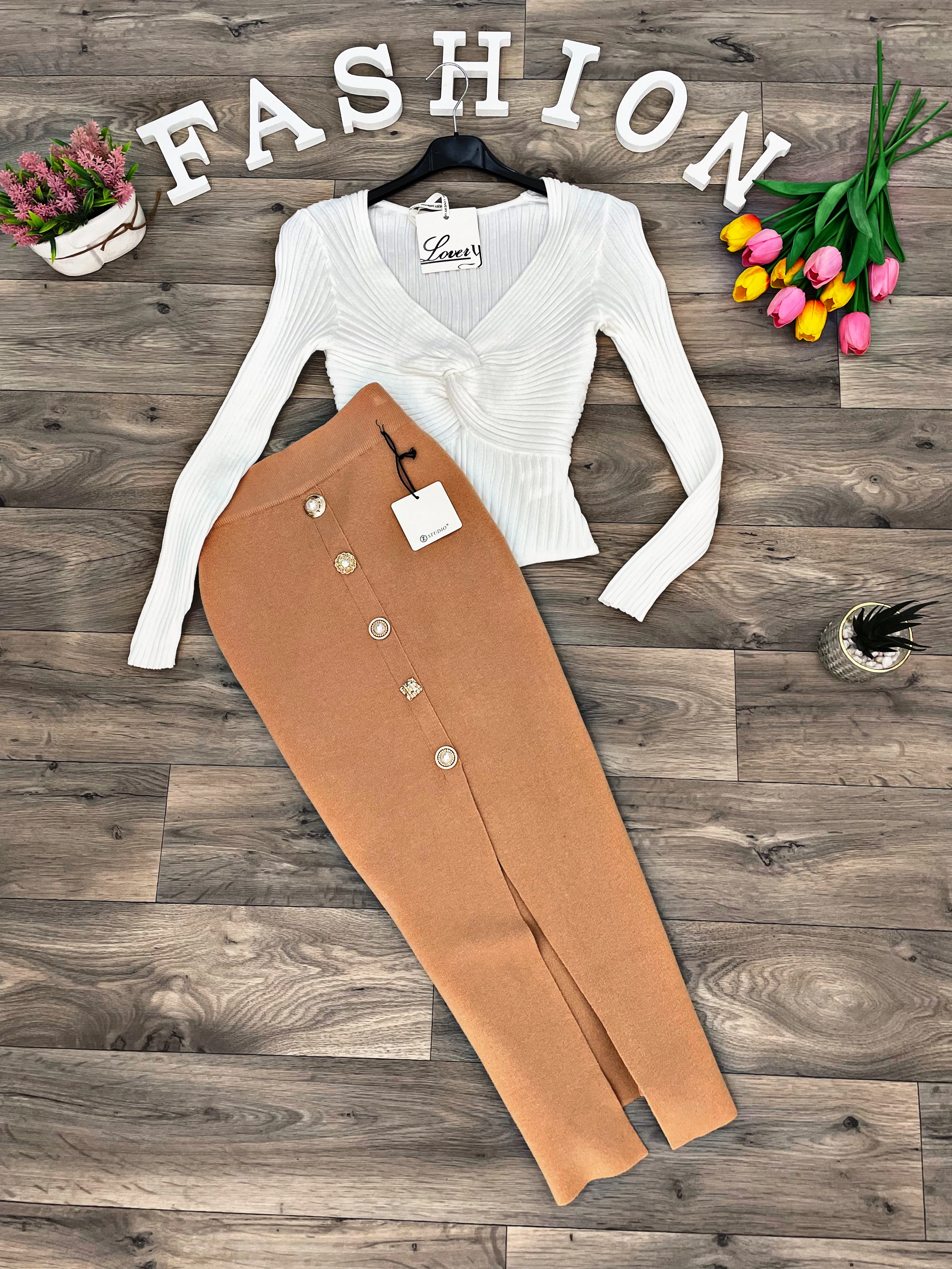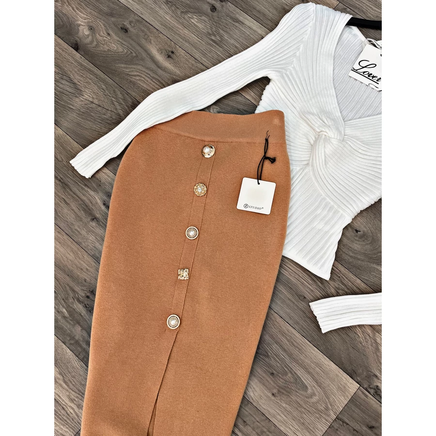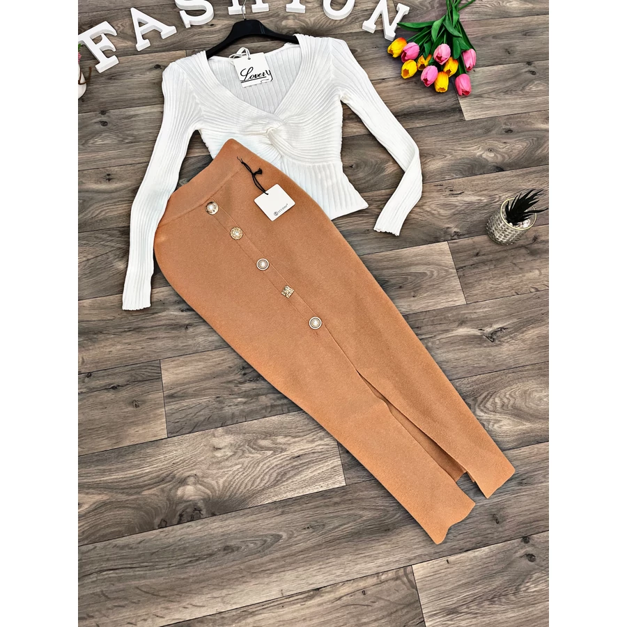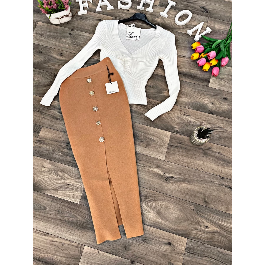 Elasztikus, kötött anyagú hosszított fazonú szoknya gombokkal díszítve.