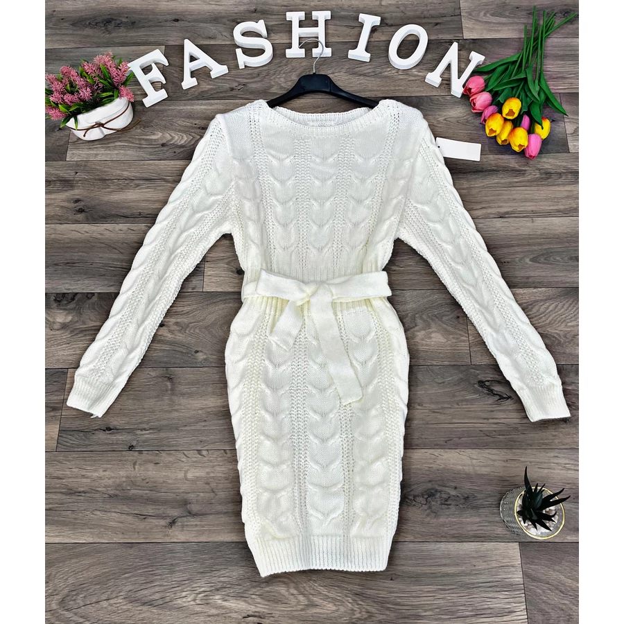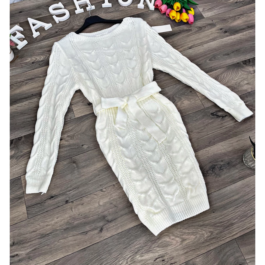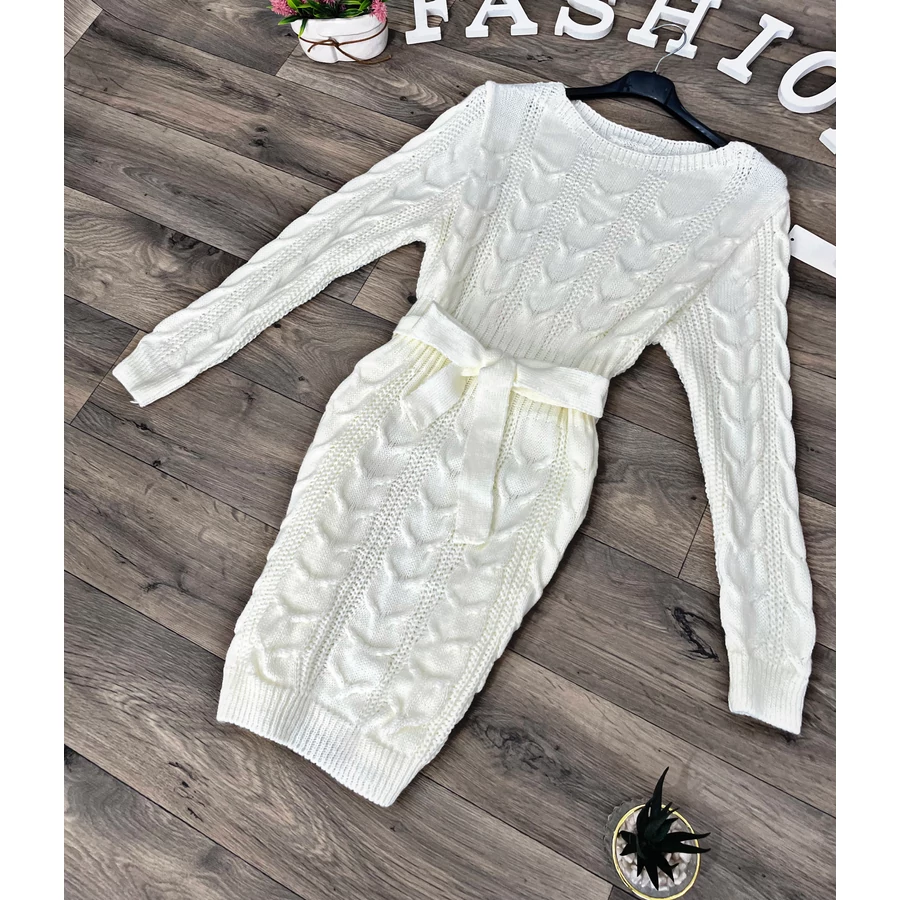 Elasztikus anyagú vastag, meleg kötött ruha övvel.