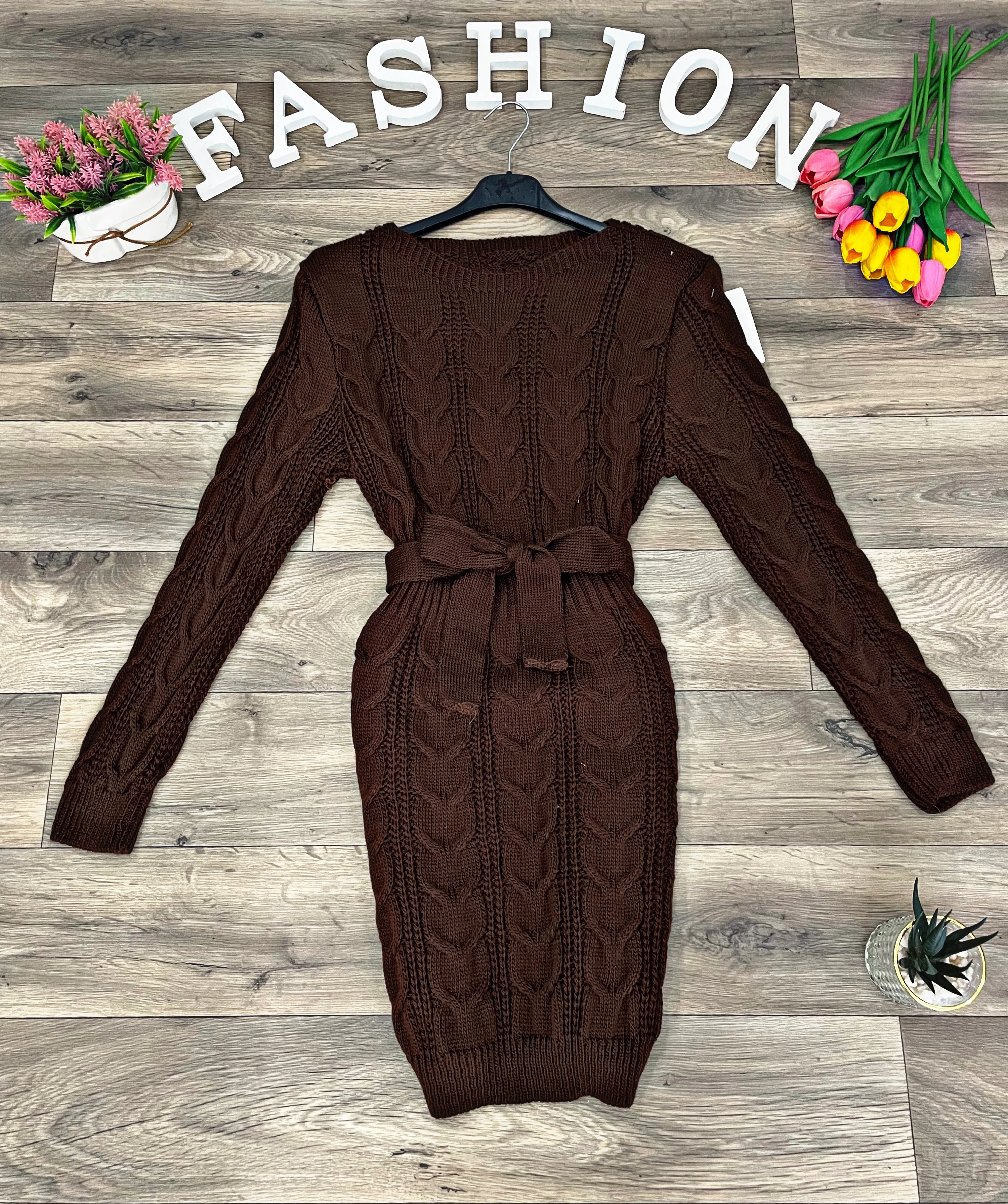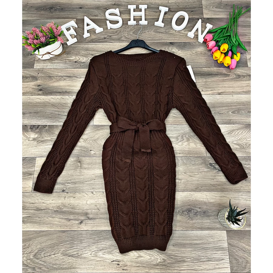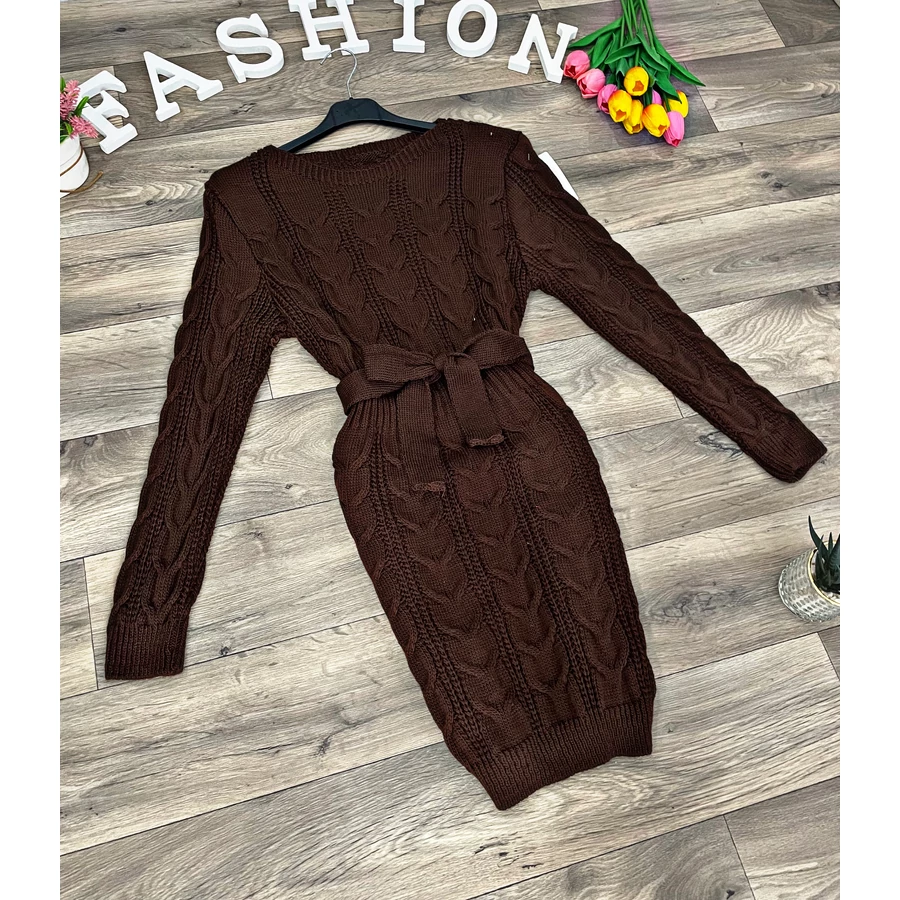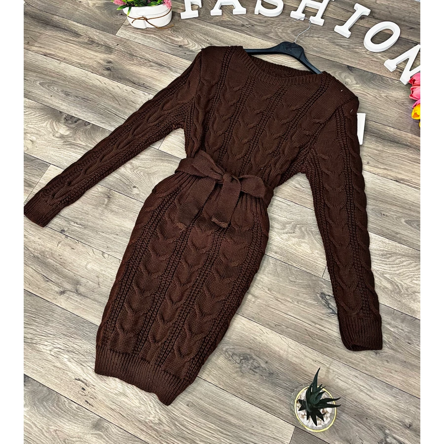 Elasztikus anyagú vastag, meleg kötött ruha övvel.