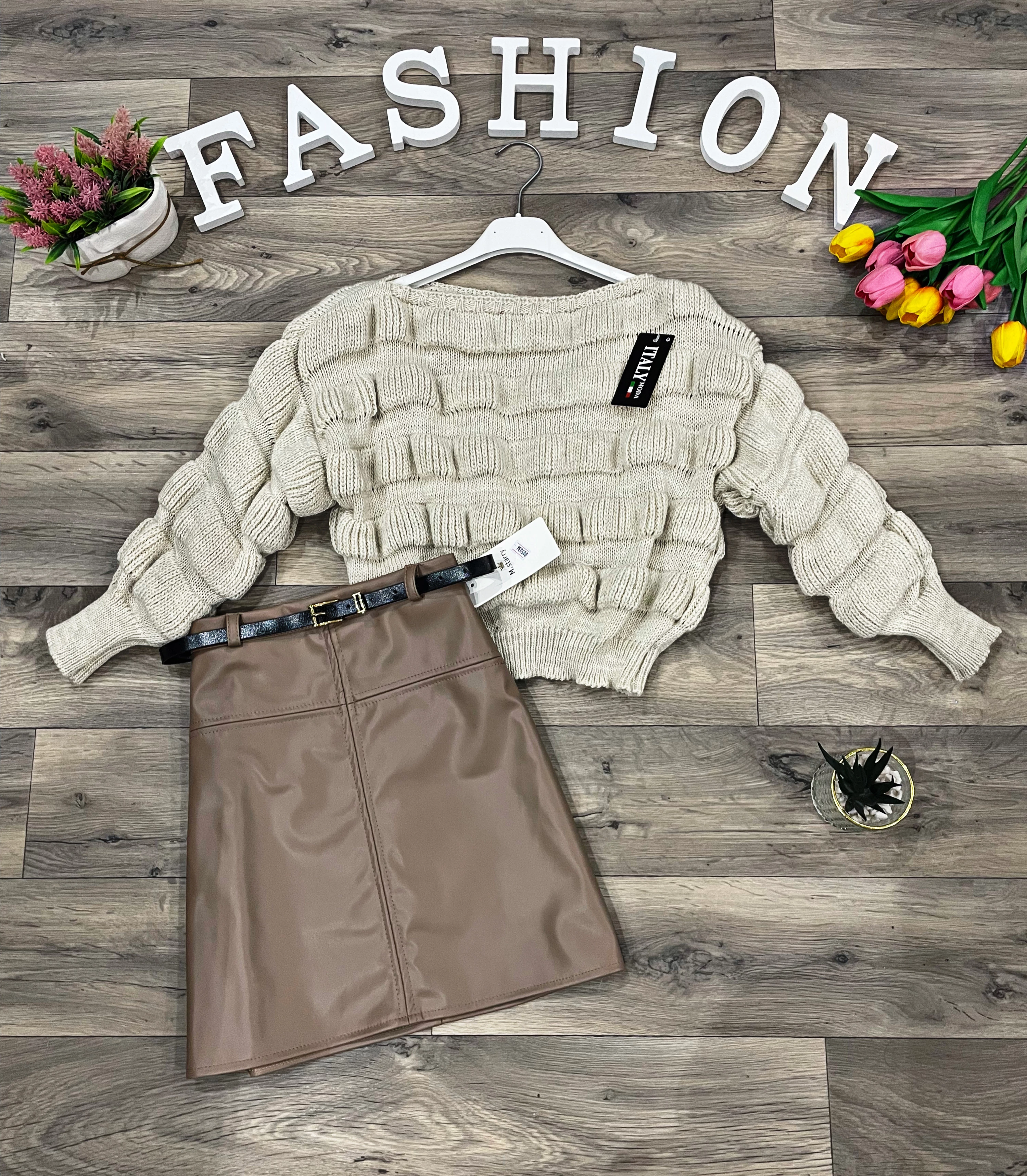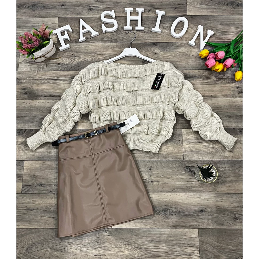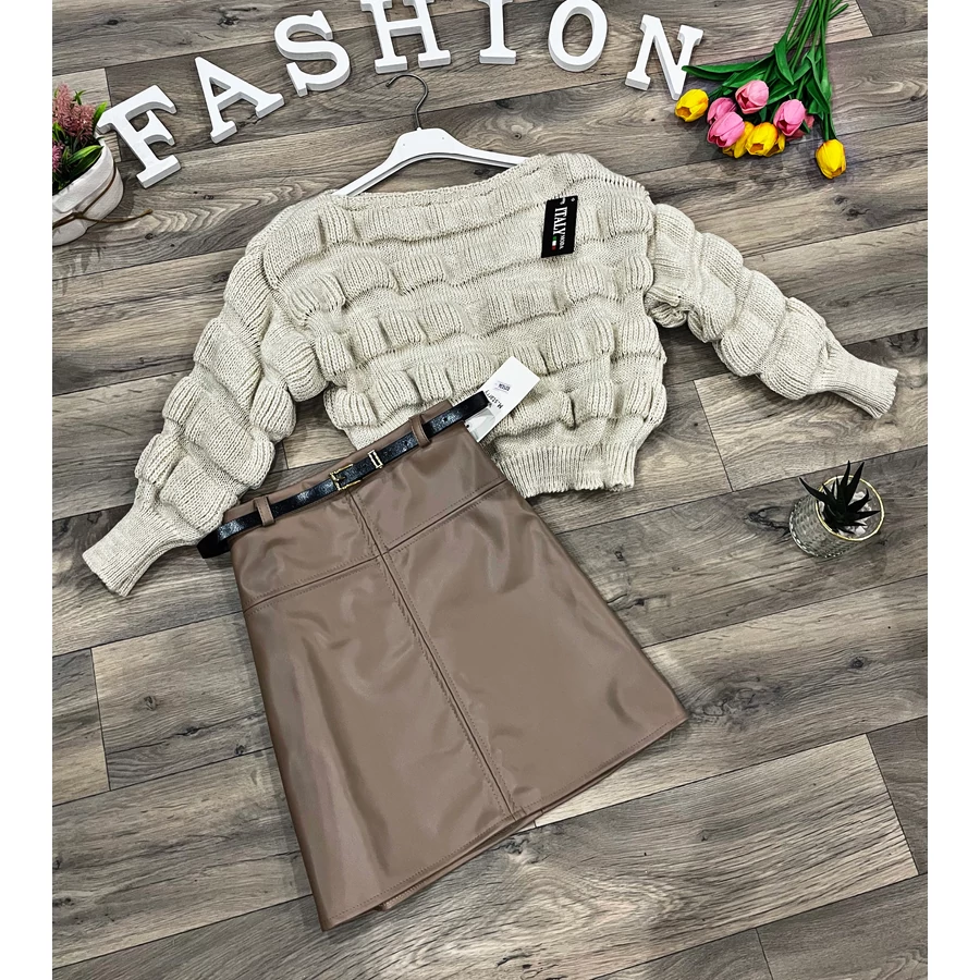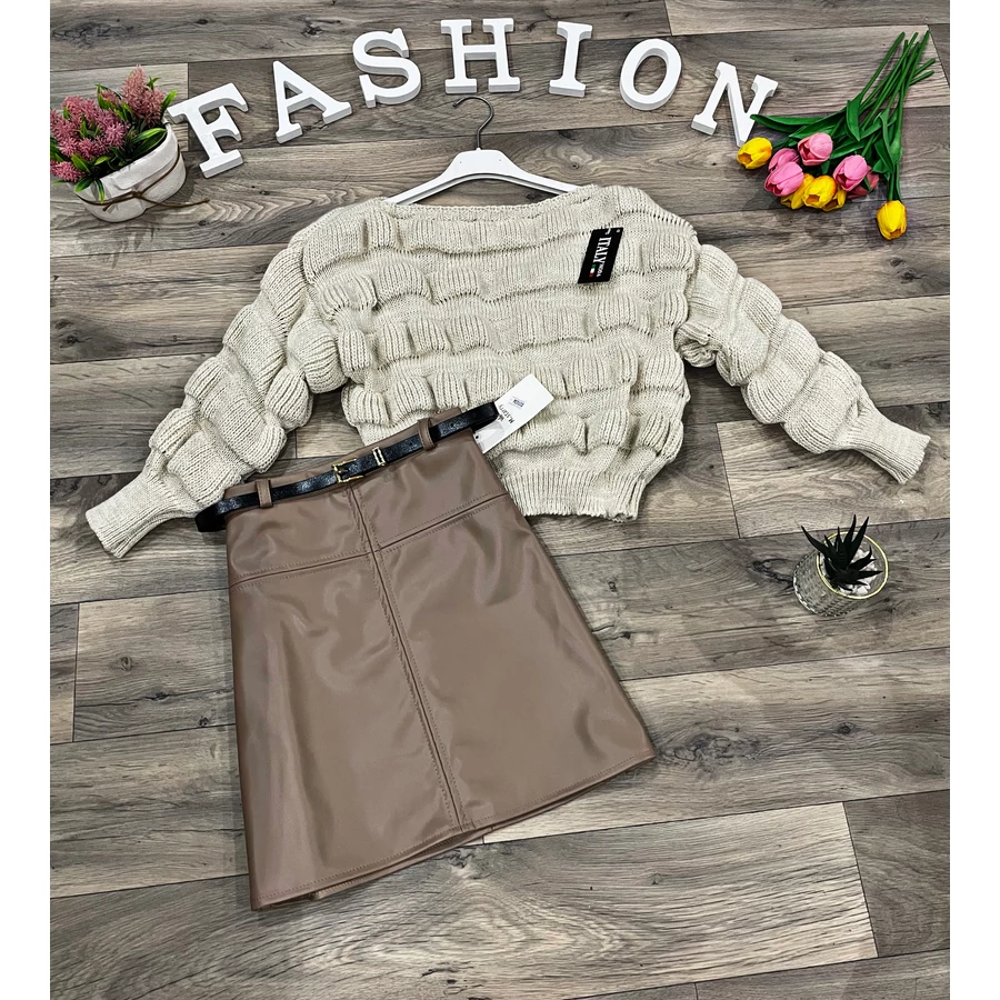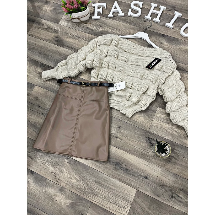 Műbőr anyagú magasított derekú szoknya műbőr övvel.